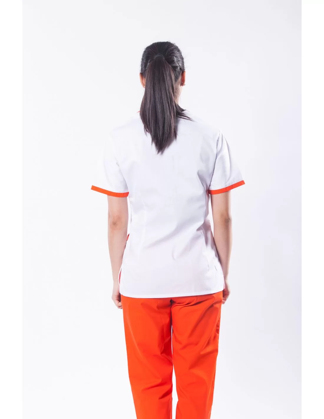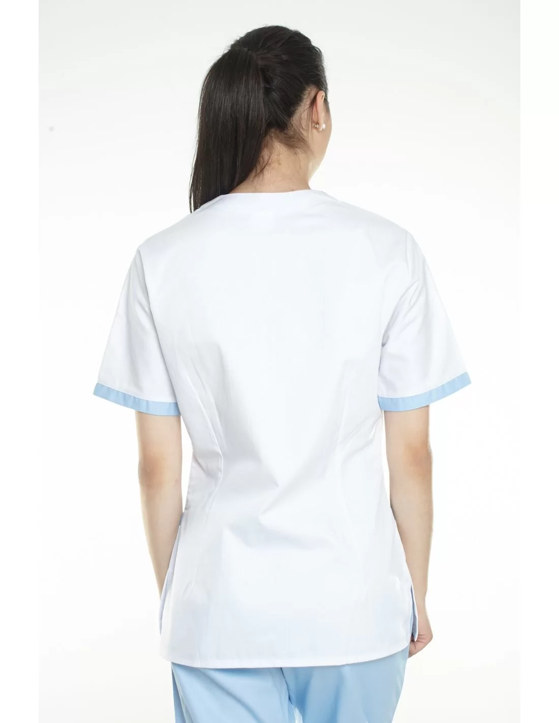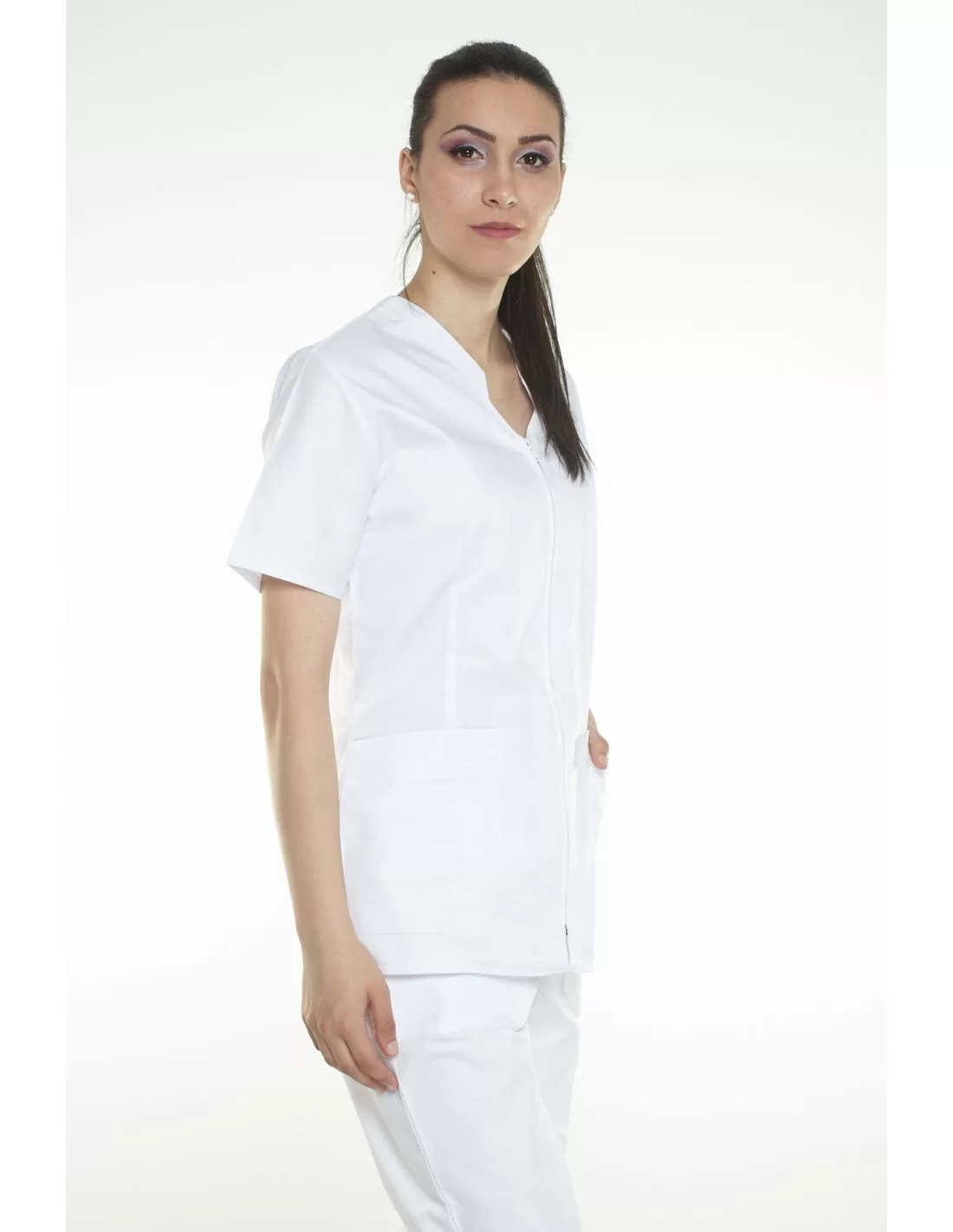 Costumul medical femei model 04 este format din 2 piese: pantaloni si bluza. Atat bluza, cat si pantalonii sunt confectionati dintr-un material care nu se decoloreaza la spalat, nu intra la apa, si nu se scamoseaza.