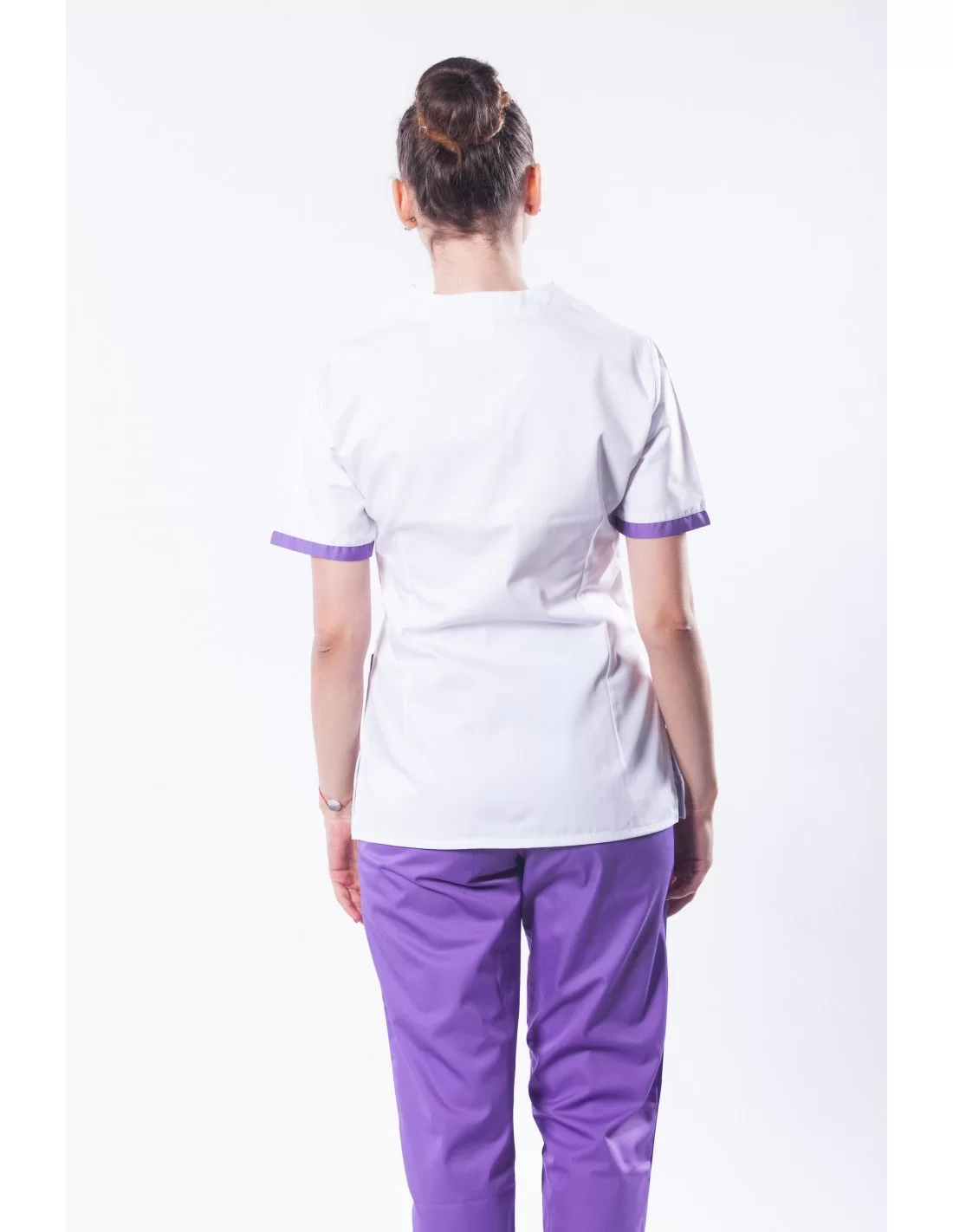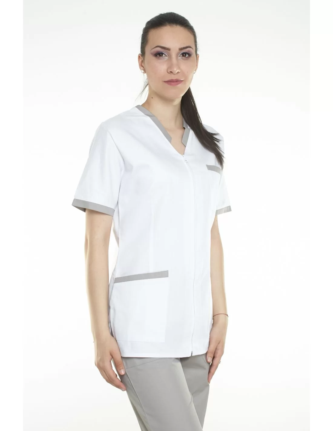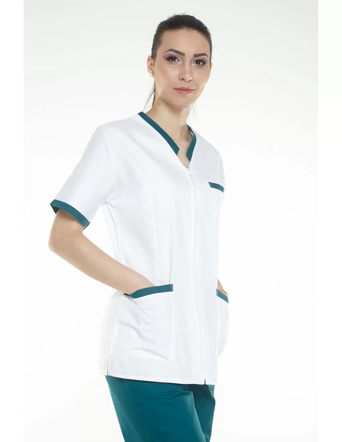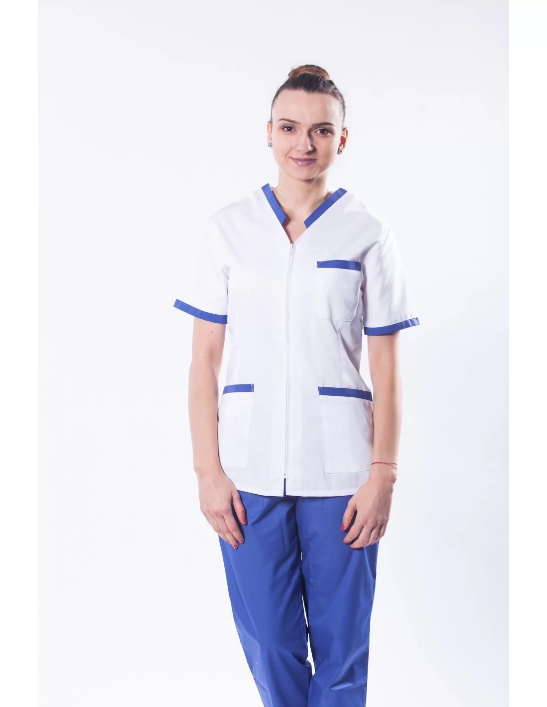 Costum medical femei model 04, cu fermoar, 2 piese, bluza alba cu garnitura colorata