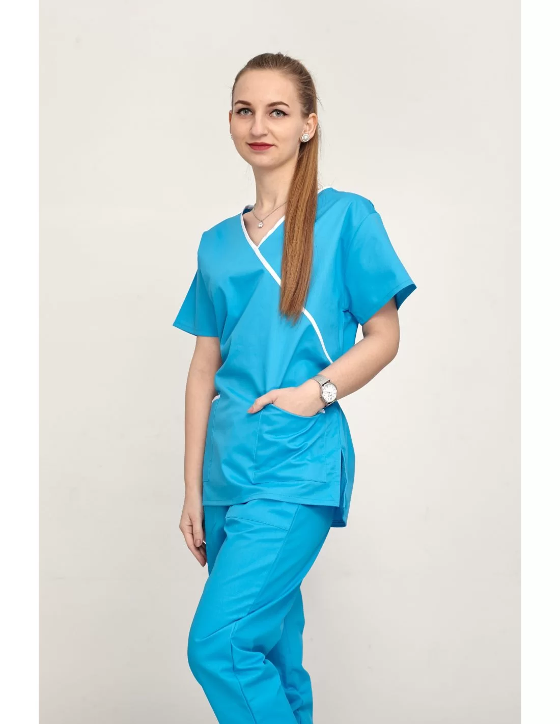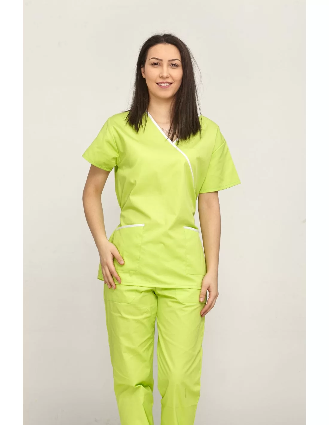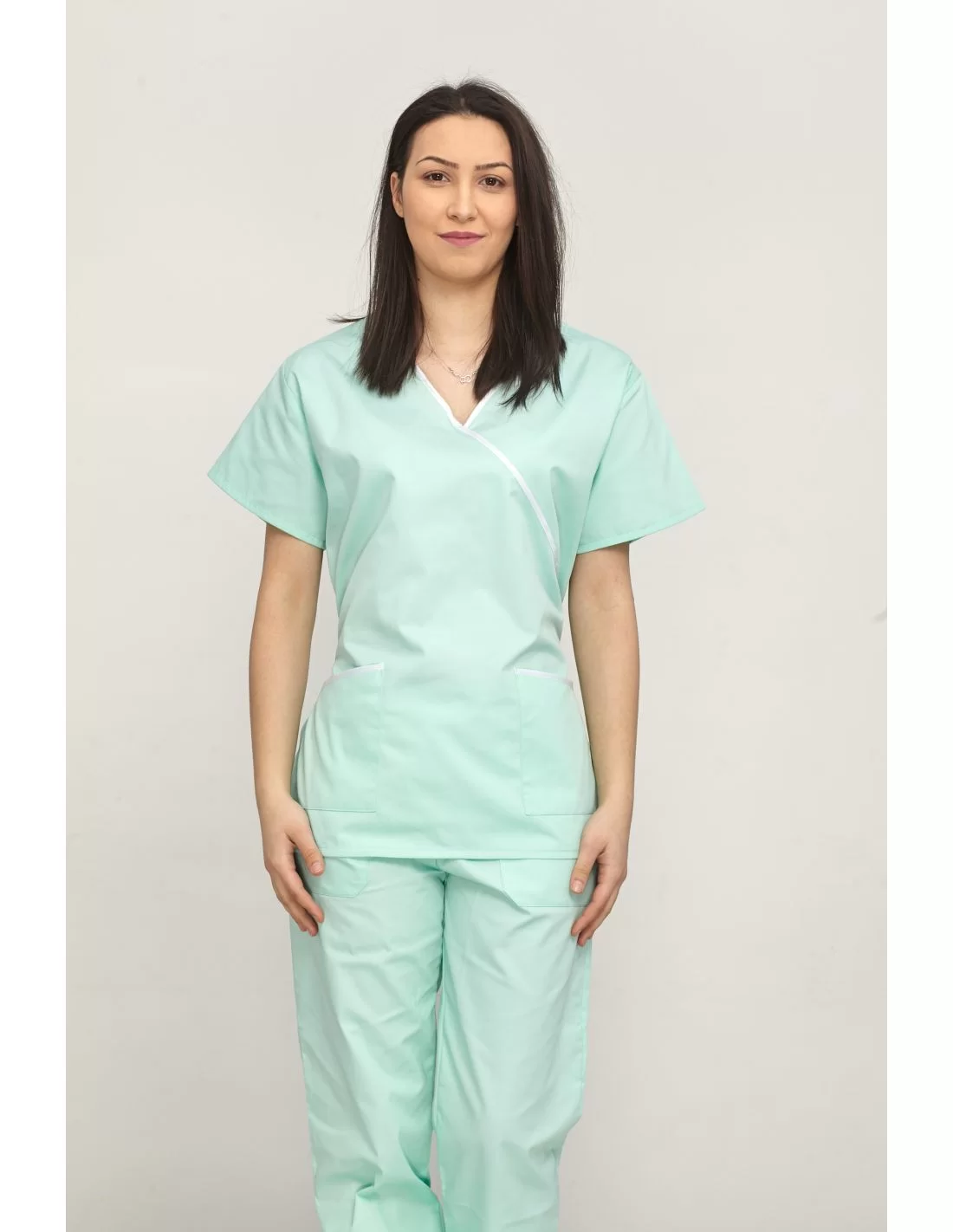 Costumul medical femei model 012 este format din 2 piese: pantaloni si bluza tip kimono, cu cordon. Bluza prezinta si 2 buzunare.